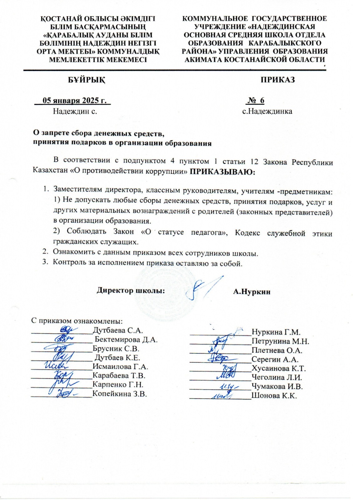Школьный приказ О запрете денежных средств, принятии подарков в организации образования